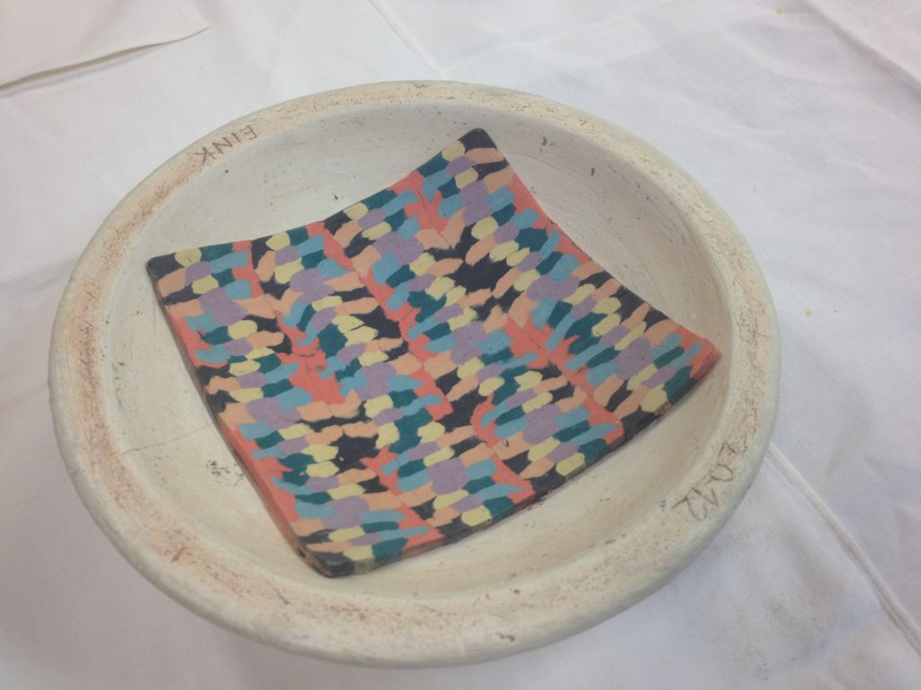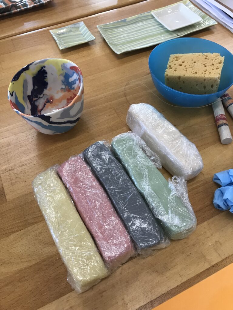 Nerikomi nennt man die Technik der «kleinen eingelegten Bildchen» aus Porzellan. Wir bewegen uns irgendwo dazwischen, denn wir werden direkt mit mehreren eingefärbten Porzellanmassen ein Gefäss modellieren resp. in Gipsformen einformen. Die Porzellanschale ist also durchgefärbt, nichts ist aufgemalt.