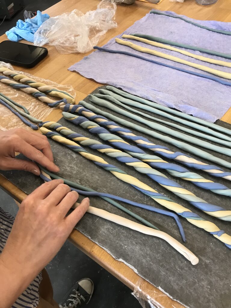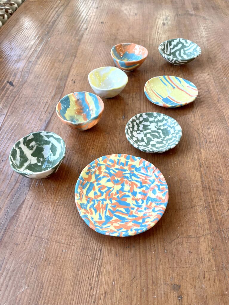 Nach dem Trocknungsprozess werden die Nerikomi-Stücke rohgebrannt, anschliessend glasiert und nochmals gebrannt.