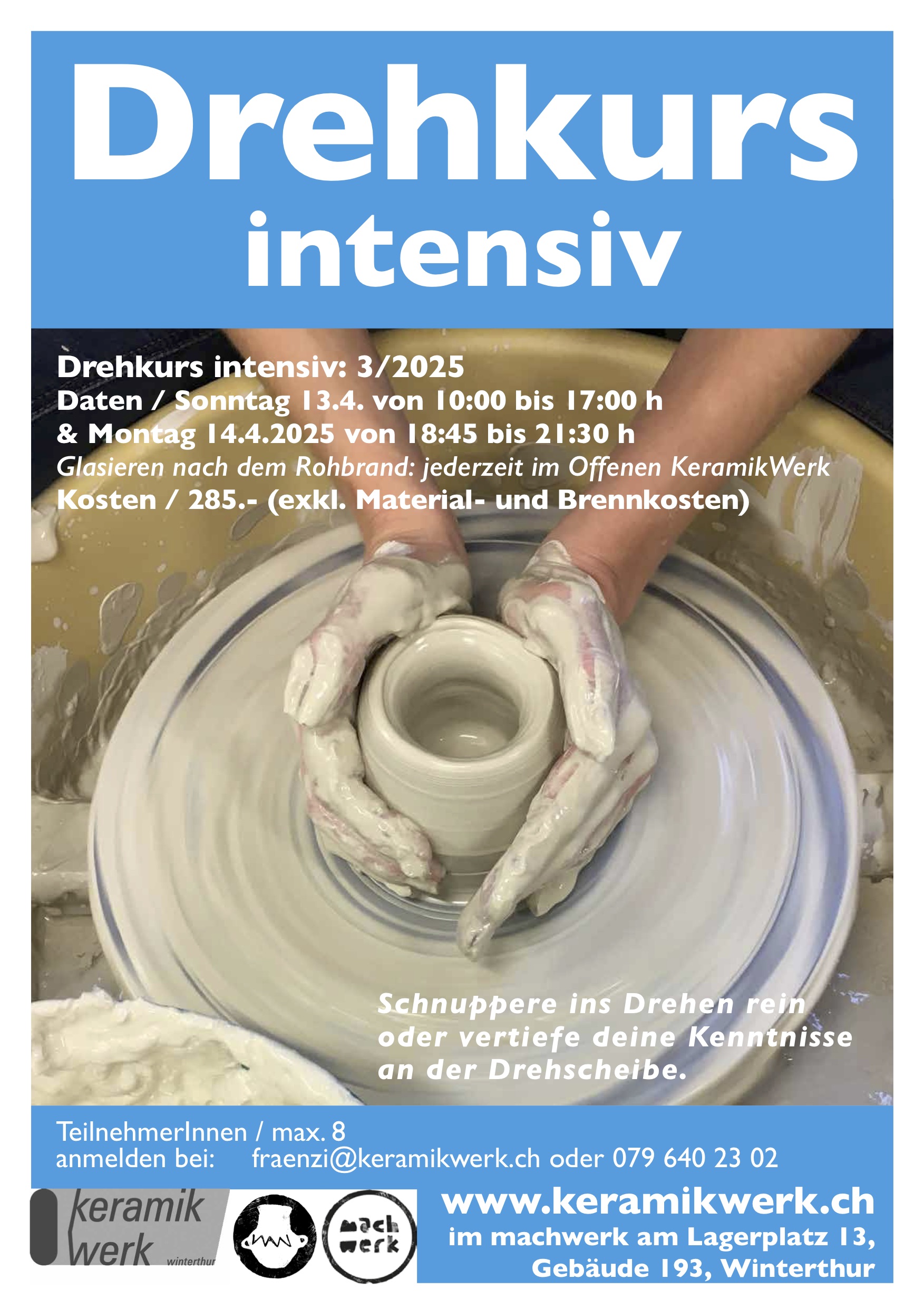 Drehkurs intensiv 3/25 Kalender Zum Kalender hinzufügen Zu Timely-Kalender hinzufügen Zu Google hinzufügen Zu Outlook hinzufügen Zu Apple-Kalender hinzufügen Einem anderen Kalender hinzufügen Als XML exportieren Wann: 14. April 2025 um 18:45 – 21:30 2025-04-14T18:45:00+02:00 2025-04-14T21:30:00+02:00 Wo: KeramikWerk Kontakt: Website der Veranstaltung