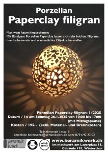 Porzellan Paperclay filigran 1/25 Kalender Zum Kalender hinzufügen Zu Timely-Kalender hinzufügen Zu Google hinzufügen Zu Outlook hinzufügen Zu Apple-Kalender hinzufügen Einem anderen Kalender hinzufügen Als XML exportieren Wann: 26. Januar 2025 um 10:00 – 17:00 2025-01-26T10:00:00+01:00 2025-01-26T17:00:00+01:00 Wo: KeramikWerk Kontakt: Website der Veranstaltung