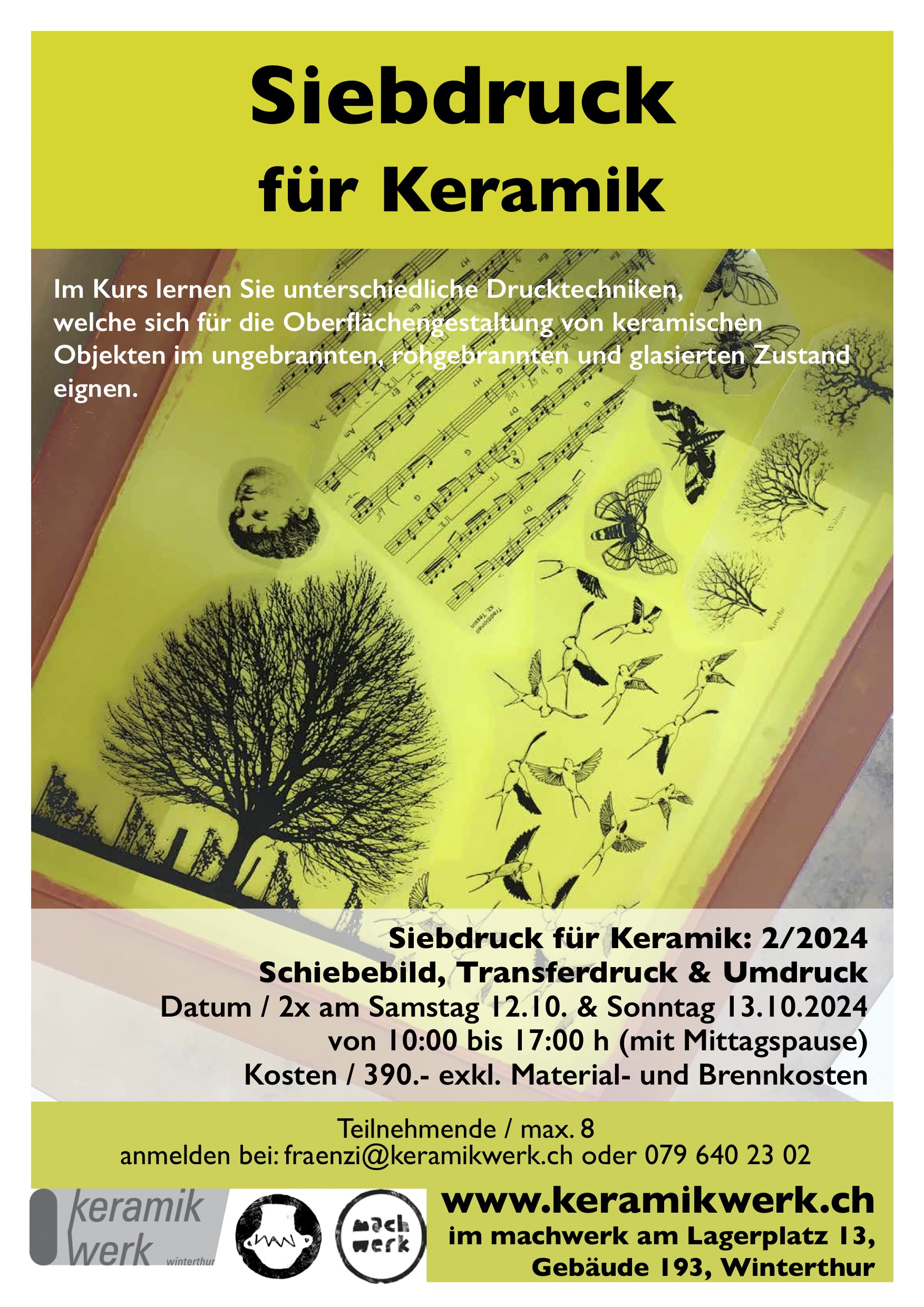 Siebdruck für Keramik 2/24 Kalender Zum Kalender hinzufügen Zu Timely-Kalender hinzufügen Zu Google hinzufügen Zu Outlook hinzufügen Zu Apple-Kalender hinzufügen Einem anderen Kalender hinzufügen Als XML exportieren Wann: 12. Oktober 2024 um 10:00 – 17:00 Repeats 2024-10-12T10:00:00+02:00 2024-10-12T17:00:00+02:00 Wo: KeramikWerk Kontakt: Website der Veranstaltung