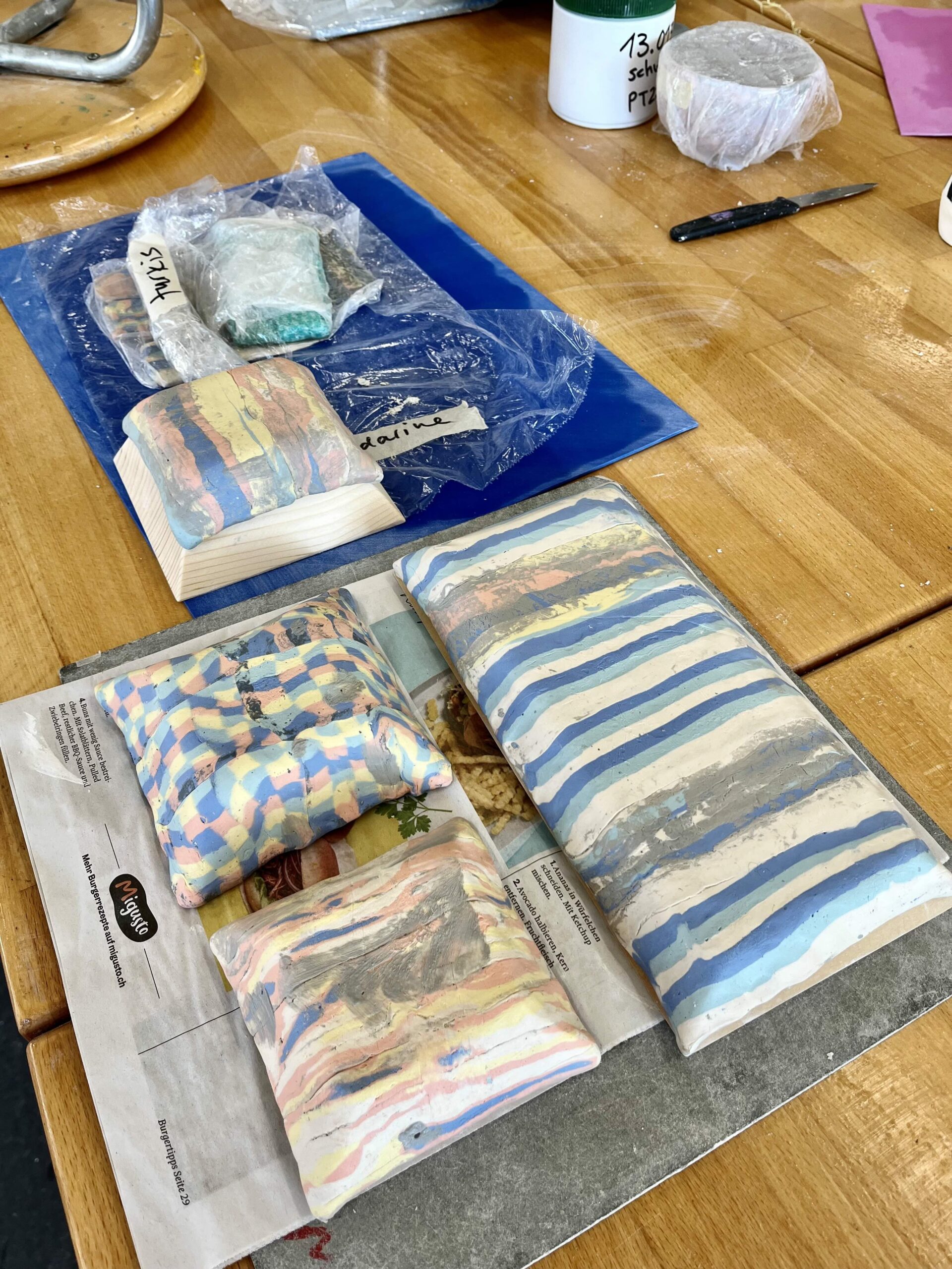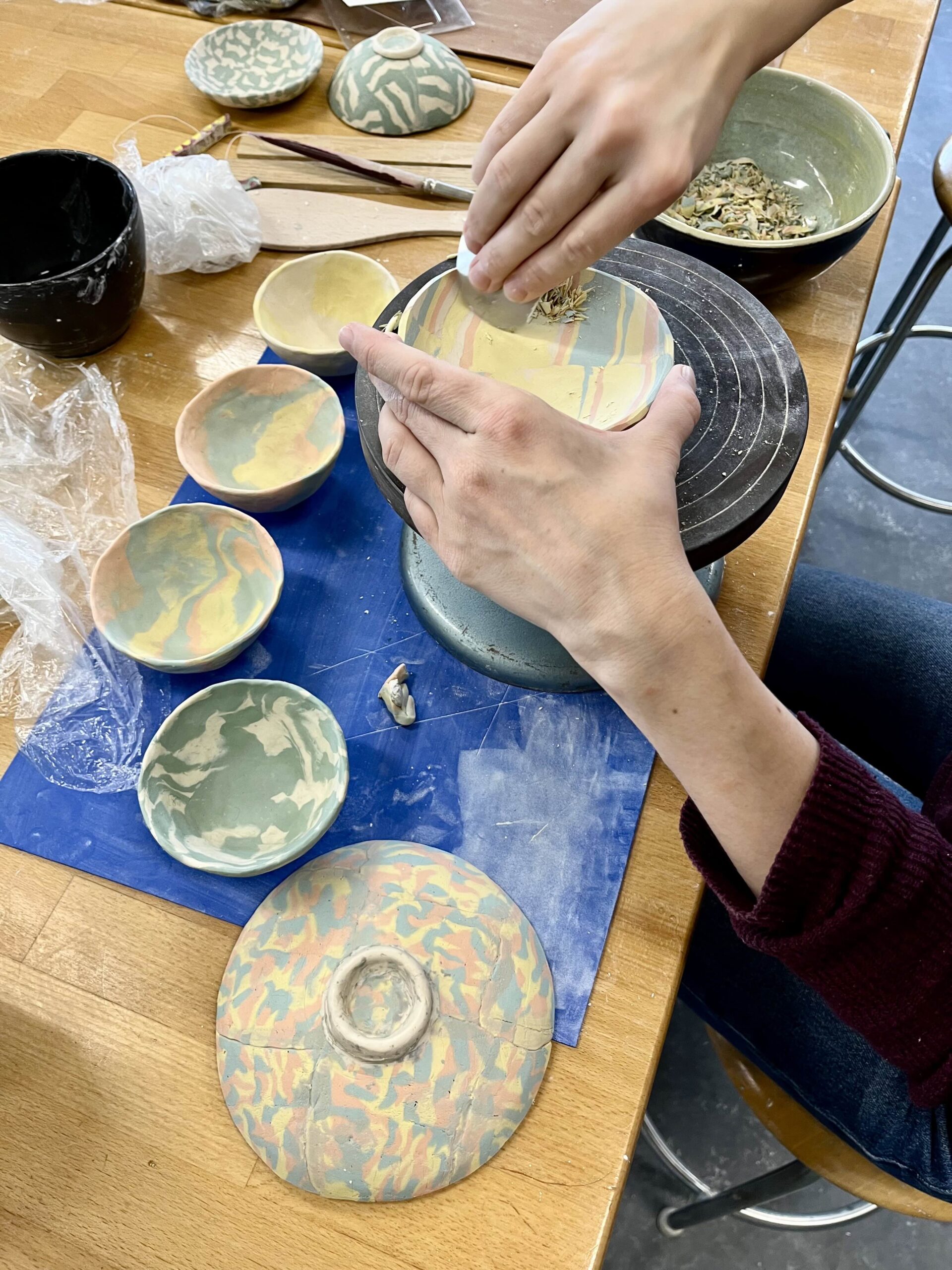 Nach dem Trocknungsprozess werden die Nerikomi-Stücke rohgebrannt, anschliessend glasiert und nochmals gebrannt.