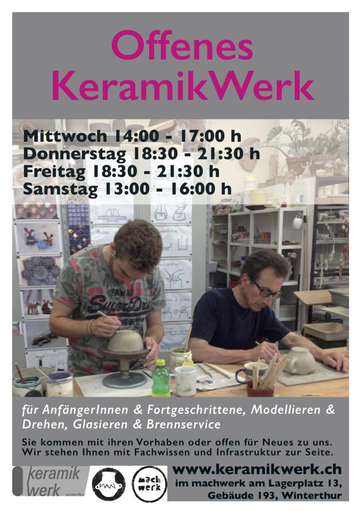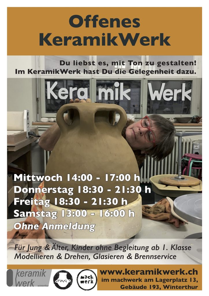 Bitte beachten Sie die AGB’s des KeramikWerks. Mit Ihrer Kursanmeldung resp. bei Nutzung des Offenen KeramikWerks willigen Sie in diese ein.