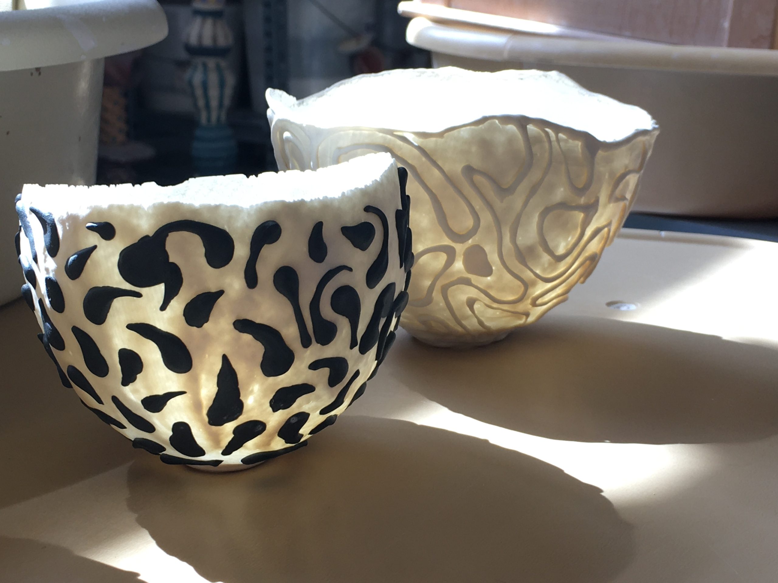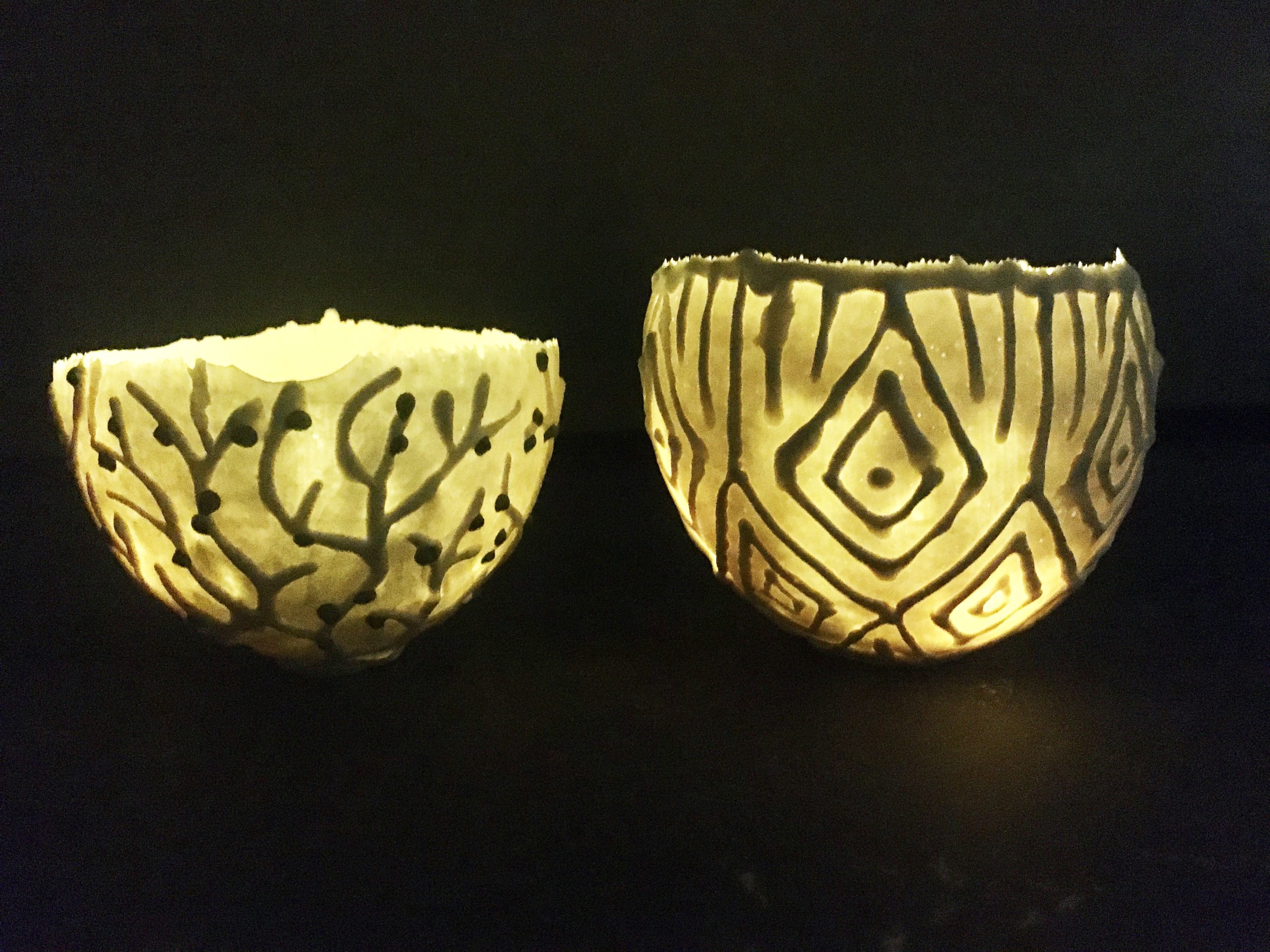 Porzellan Paperclay lässt sich so dünn verarbeiten, dass es nach dem Brand bei 1240°C transluszent ist. Kerzenlicht vermag mit warmem Licht durchzuflackern. Mit Malhörnchen und farbigem Paperclay-Schlicker applizieren Sie Ornamente und Verzierungen auf den getauchten Rohling: So spielt Licht und Schatten, und Sie geben Ihrem Windlicht den individuellen Touch.